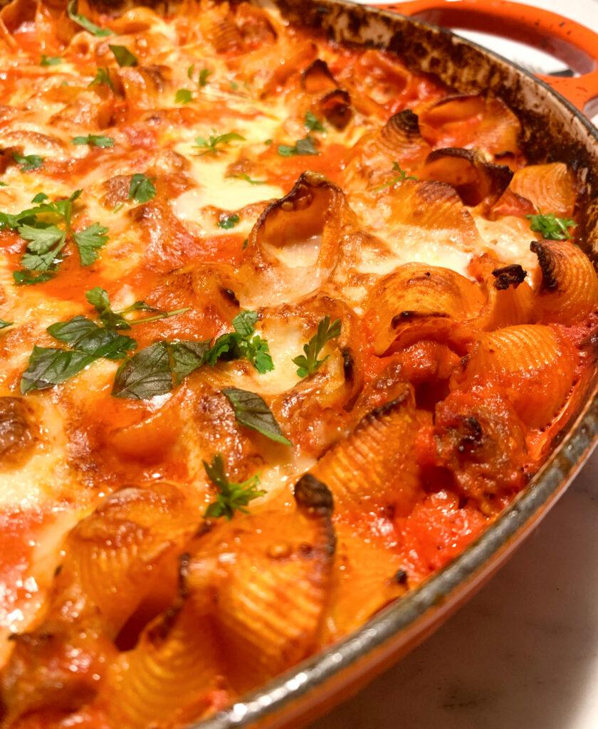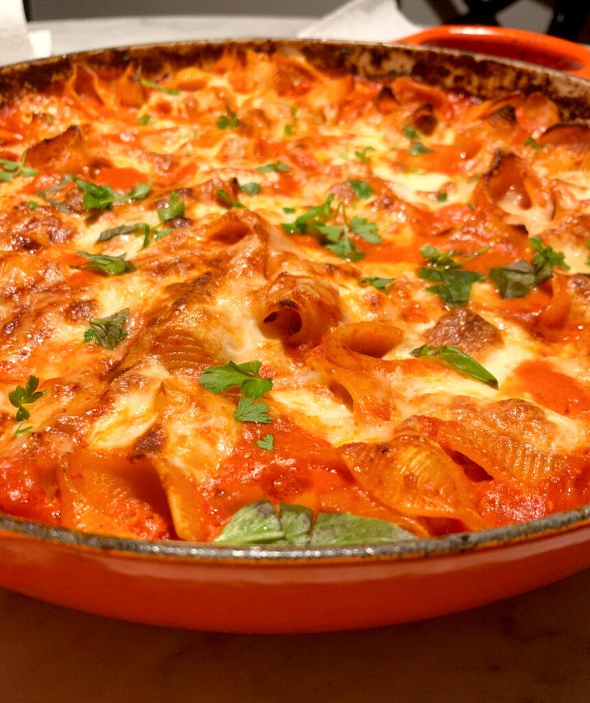 Fold in the pasta and extra water. See note above about how much water to add. Allow sauce and pasta to return to a simmer, then cook the sauce on the stove top for 2 minutes. Turn off heat under the pot and then fold in about 1/3 of the mozzarella and ½ of the parsley. Sprinkle the rest of the mozzarella and all of the Parmesan evenly across the top. Bake in the oven about 20-24 minutes until the sauce is bubbling and the pasta is cooked through. If cheese has not yet formed a crisp cap by the end of the baking tie, broil for a minute or two (watch it carefully so it doesn’t burn). Remove from the oven.